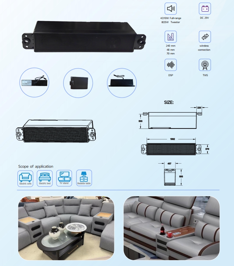 智能家居音响系列-热卖款 RYYT01 由 admin | 5 月 5, 2025 | 智能家居 产品简介: ○ 智能家居蓝牙音响 ○ 应用领域:电动床,电动沙发,床头柜 ○ 功能:CD级别音质,最高64个自组网,支持手机,电视蓝牙连接。 产品型号: RYYT01 扬声器单元 4欧10W 全频一个,+8欧5W PP盆高音一个。 电源 DC 18-29V /1-2A 音频输入 蓝牙连接 蓝牙版本 5.3 蓝牙格式: LC3编解码的高压缩率、高保真、短包特性 传输: CIS/BIS传输协议提供了点对点,点对多的通讯 输入灵敏度 700+50MV 失真度 ≦0.5% 信噪 ≧88db 条形音箱尺寸 244mm*48mm*66mm 功率 1X15W